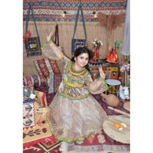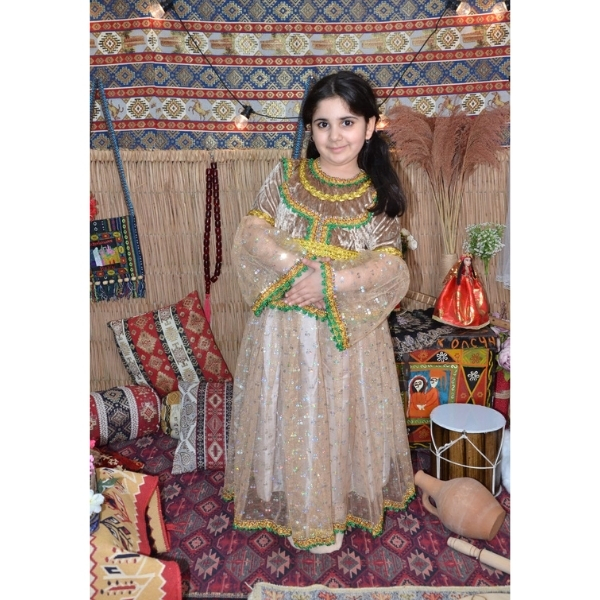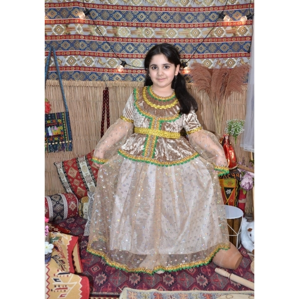 Bej rəngdə hazırlanmış bu qız uşaq milli geyimi zərif dizaynı və incə bəzəkləri ilə seçilən klassik Azərbaycan milli geyim modellərindən biridir. Açıq tonlarda atlas və tül materialın birləşməsi geyimə həm yüngül, həm də çox zərif görünüş verir. Yaşıl və qızılı haşiyələrlə işlənmiş dekorativ elementlər modelə milli üslub və bayram ab-havası qatır. Bu geyim Novruz bayramı, bağça və məktəb tədbirləri, səhnə çıxışları, folklor proqramları və fotosessiyalar üçün uyğun olan ən çox seçilən uşaq milli geyimlərindən biridir.