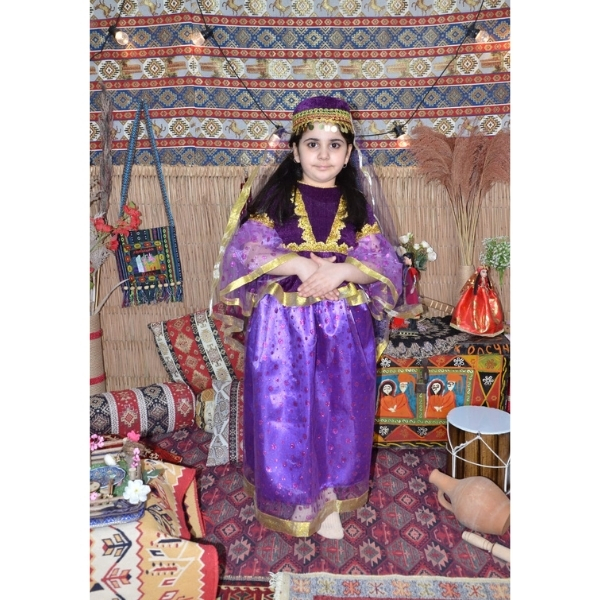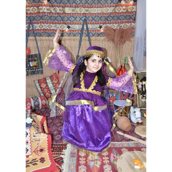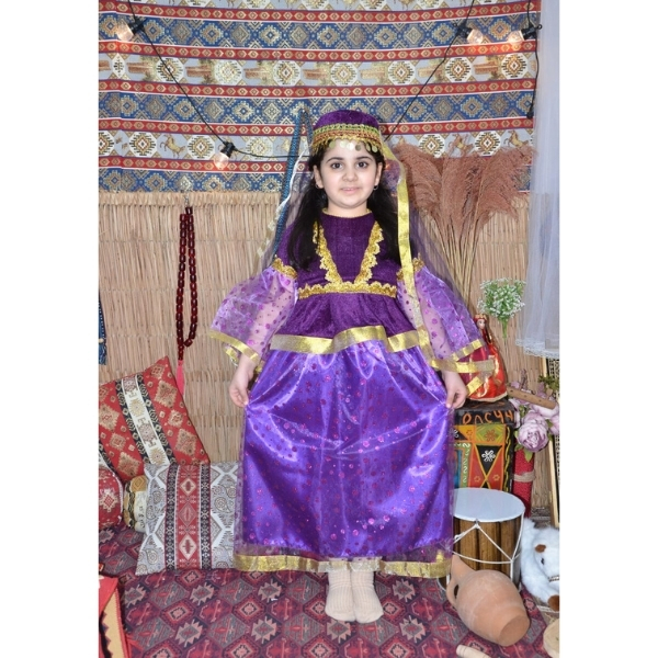Bənövşəyi rəngdə hazırlanmış bu qız uşaq milli geyimi Azərbaycan milli geyim ənənələrinə uyğun tikilmiş zərif və gözəl modellərdən biridir. Parlaq atlas parça, qızılı haşiyələr və şəffaf tül elementlər geyimə xüsusi incəlik və bayram görünüşü verir. Bu model Novruz bayramı, bağça və məktəb tədbirləri, səhnə çıxışları, folklor proqramları və fotosessiyalar üçün ən çox seçilən uşaq milli geyimlərindən biridir.