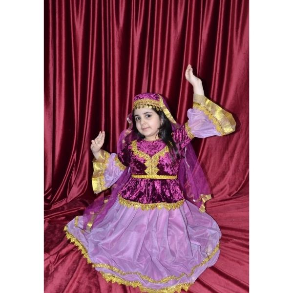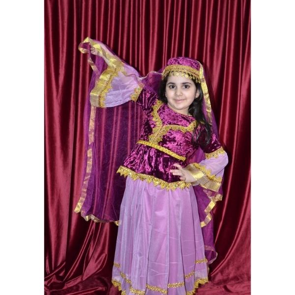 Bənövşəyi və açıq çəhrayı tonların harmoniyası ilə hazırlanmış bu qız uşaq milli geyimi Azərbaycan milli geyim üslubunu əks etdirən zərif və diqqətçəkici modellərdən biridir. Parlaq məxmər parça, qızılı haşiyələr və yüngül tül elementlər geyimə xüsusi gözəllik verir. Bu model Novruz bayramı, bağça və məktəb tədbirləri, folklor proqramları, səhnə çıxışları və fotosessiyalar üçün çox uyğun seçimdir.