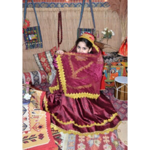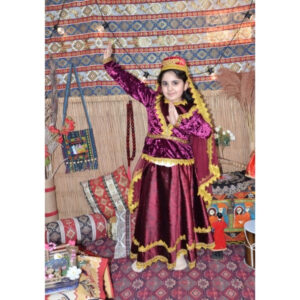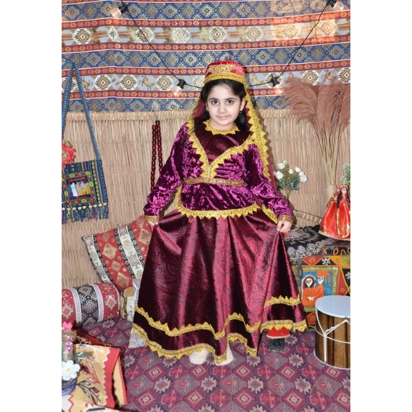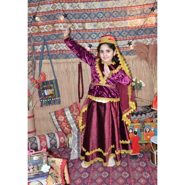 Bordo rəngdə hazırlanmış bu qız uşaq milli geyimi Azərbaycan milli geyim ənənələrinə uyğun tikilmiş zərif və klassik modellərdən biridir. Məxmər parça, qızılı ornamentlər və parlaq atlas ətək hissəsi geyimə zəngin və diqqətçəkici görünüş verir. Bu model Novruz bayramı, bağça və məktəb tədbirləri, səhnə çıxışları, folklor proqramları və fotosessiyalar üçün ən çox seçilən uşaq milli geyimlərindən biridir.