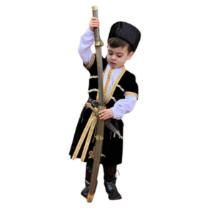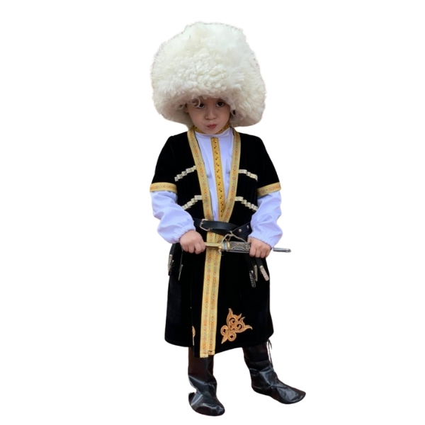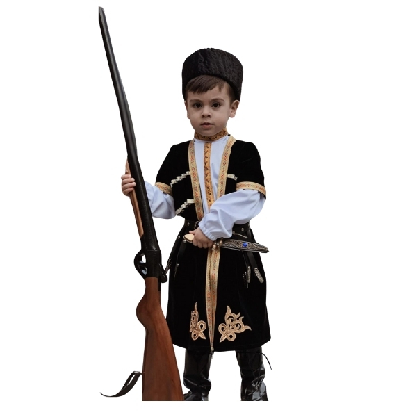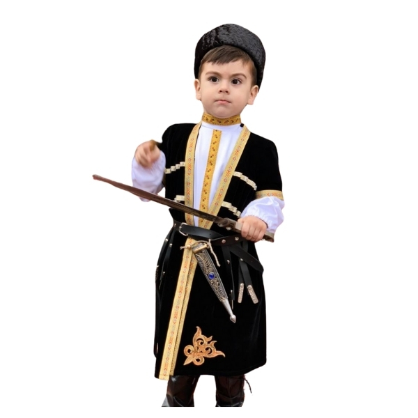 Oğlan uşaqları üçün nəzərdə tutulmuş bu qara çuxa papaqlı dəst milli obrazı tam komplekt şəkildə təqdim edir və gündəlik hərəkətdə rahat qalacaq şəkildə hazırlanıb. Məxmər fakturalı çuxa qızılı haşiyələrlə bəzədilib, sinə hissəsindəki kapsul detallar və beldə kəmər geyimin nizamlı siluetini vurğulayır.