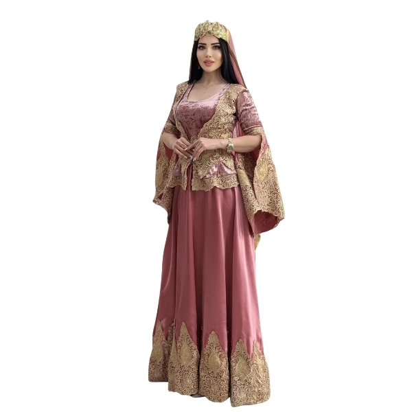 Qadınlar üçün nəzərdə tutulmuş bu pudra tonlu, qızılı zərli milli dəst klassik Azərbaycan geyim ənənəsini zərif modern detallar ilə birləşdirir. Yumşaq toxumalı atlas/məxmər qarışımı parça bədənin formasını incə göstərir, kənarlarında işlənmiş qızılı haşiyələr və naxışlar isə siluetə təmtəraq qatır. Komplekt uzun ətəkli paltar, zərli yelek tipli üst, beldə bağlanan kəmər və uyğun baş örtüyündən ibarətdir;