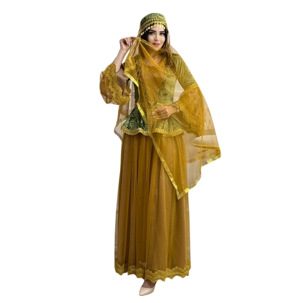 Zərifliyi və komfortu birləşdirən bu zeytun-xardal tüllü milli dəst mərasim və səhnə üçün ideal seçimdir. Üst hissə yumşaq zeytun yaşıl məxmərdən hazırlanıb, qızılı-yaşıl naxış və haşiyələrlə vurğulanır; beldəki peplumvari kəsim fiquru incə göstərir. Alt hissədə xardal tonlarında axıcı tül ətək yer alır: çoxqatlı quruluş sayəsində yerişdə yüngül dalğalanma yaradır, fotolarda və videoda təsirli görünür. Geniş, kəpənəkvari qollar hərəkət azadlığı verir, uyğun baş örtüyü kompozisiyanı tamamlayır. Xınayaxdı proqramları, Novruz və milli rəqs çıxışları, məktəb və korporativ tədbirlər, eyni zamanda tematik fotosessiyalar üçün əladır.