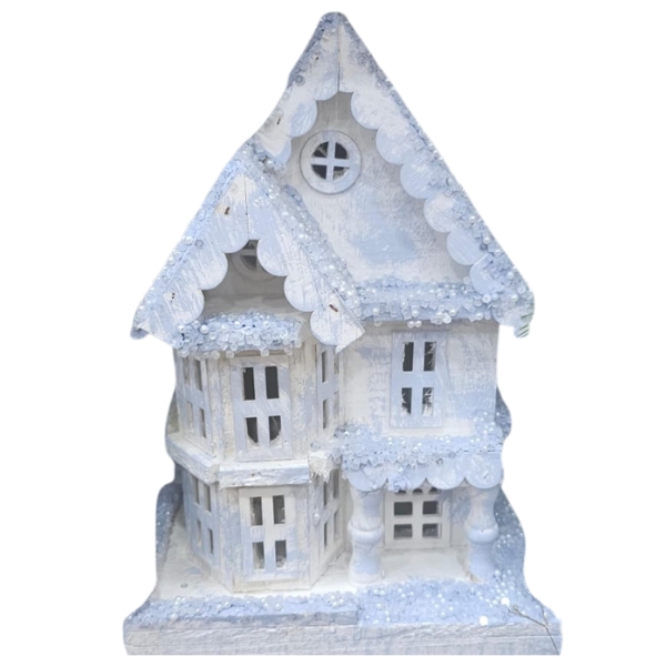 Bu dekorativ nağıl evi oyuncağı qış mövsümünün sehrini özündə daşıyan unikal və zərif bir dizayna malikdir. Pastel ağ-mavi çalarlarında işlənmiş bu ev, sanki qar altında donmuş bir qış məkanından çıxmış kimi görünür. Dam və pəncərə altlıqlarında istifadə olunan incə parıltılar, qartopu effektli bəzəklər və toxuma detalları məhsula həm nostalji, həm də şərq nağılını xatırladan atmosfer verir. Evin pəncərələri tam dekor üslubunda hazırlanıb, işıq altında parıldayaraq daha da cazibədar görünür.