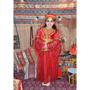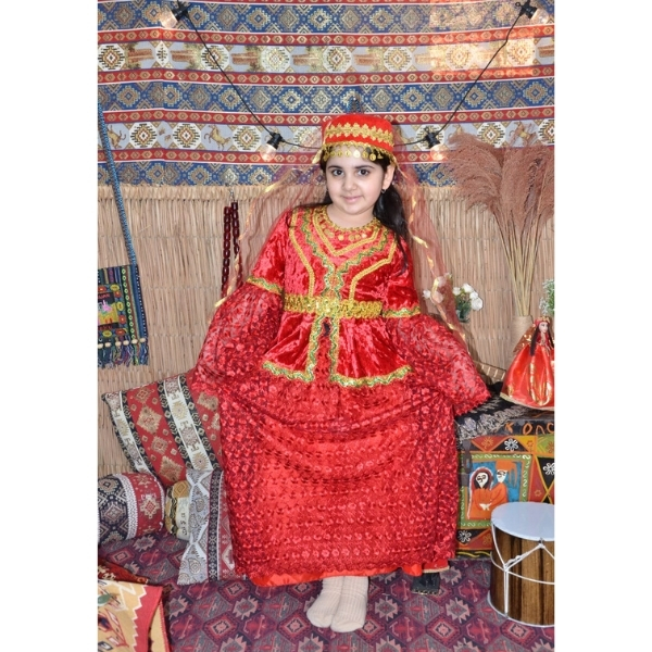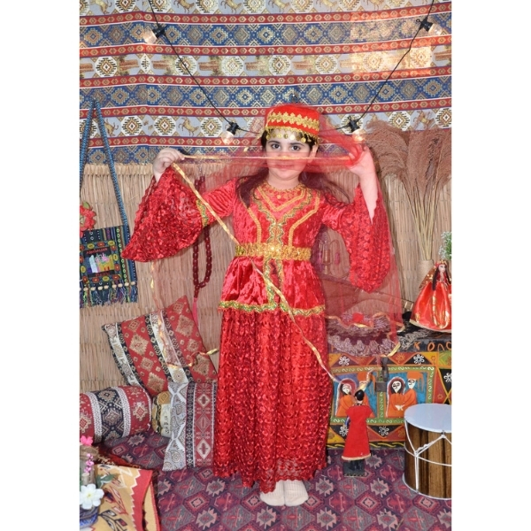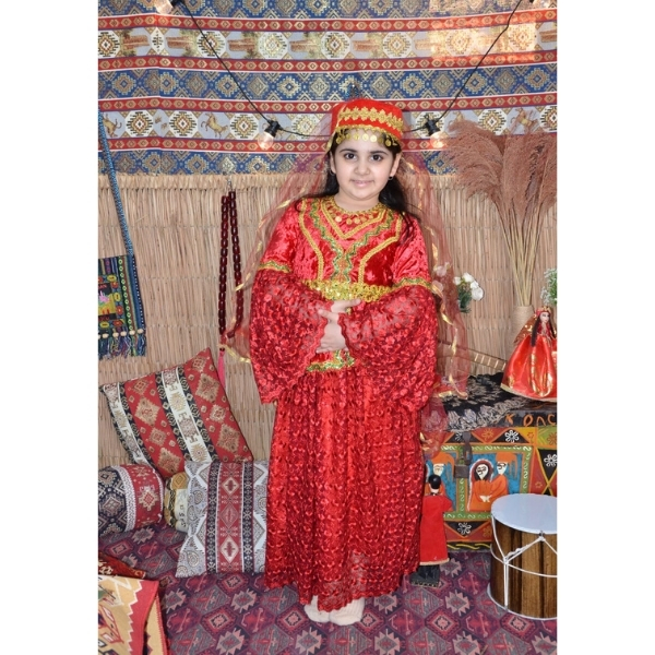 Qırmızı rəngdə hazırlanmış bu qız uşaq milli geyimi klassik Azərbaycan üslubunu əks etdirən ən gözəl modellərdən biridir. Məxmər və naxışlı parça birlikdə istifadə olunduğu üçün geyim həm zəngin, həm də bayram ab-havalı görünür. Parlaq qırmızı rəng və qızılı haşiyələr milli geyimə xüsusi görkəm verir və səhnə, Novruz tədbirləri, bağça və məktəb proqramları üçün ideal seçim hesab olunur.