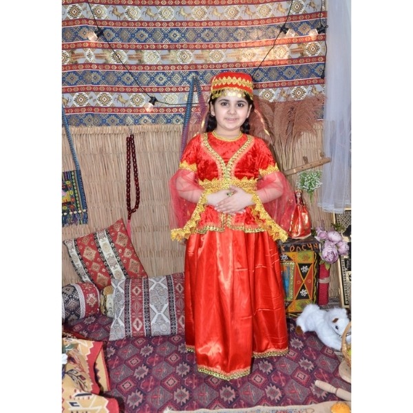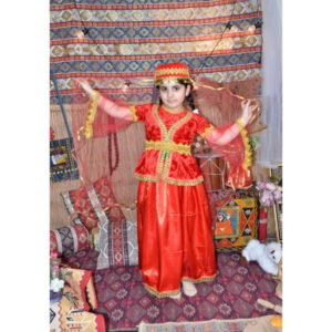 Qırmızı rəngdə hazırlanmış bu qız uşaq milli geyimi Azərbaycan milli geyim ənənələrinə uyğun tikilmiş zərif və klassik modellərdən biridir. Parlaq atlas parça, qızılı ornamentlər və milli üslubda hazırlanmış aksesuarlar geyimə xüsusi gözəllik və bayram ab-havası verir. Bu model Novruz bayramı, bağça və məktəb tədbirləri, səhnə çıxışları, folklor proqramları və fotosessiyalar üçün ən çox seçilən uşaq milli geyimlərindən biridir.