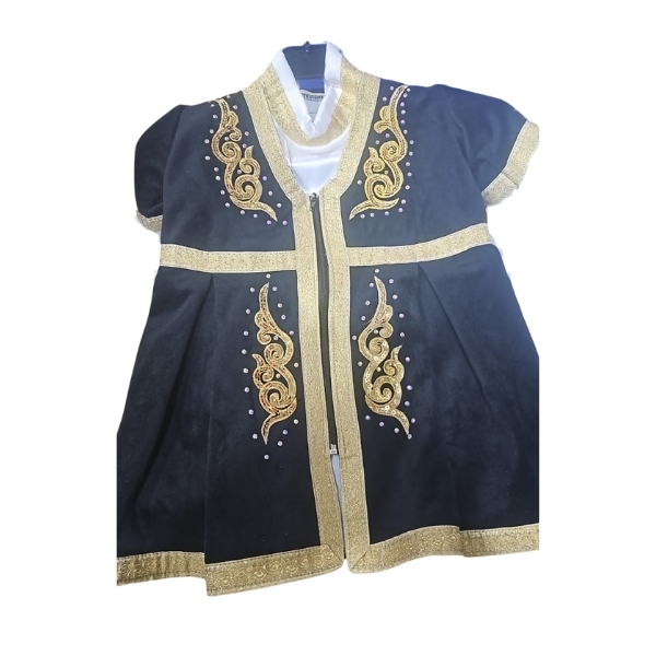 Qız uşaqları üçün nəzərdə tutulmuş bu qara qısaqollu zərli dəst klassik milli üslubu yüngül və rahat kəsimlə birləşdirir. Məxmər fakturalı üst hissə qızılı haşiyələr və simmetrik naxış appliqasiyaları ilə tamamlanır; ön xəttdəki bəzək zolaqları silueti nizamlayır və fiquru incə göstərir. Dəstin daxilində ağ rəngli, boğaz hissəsini örtən içlik hissə var;