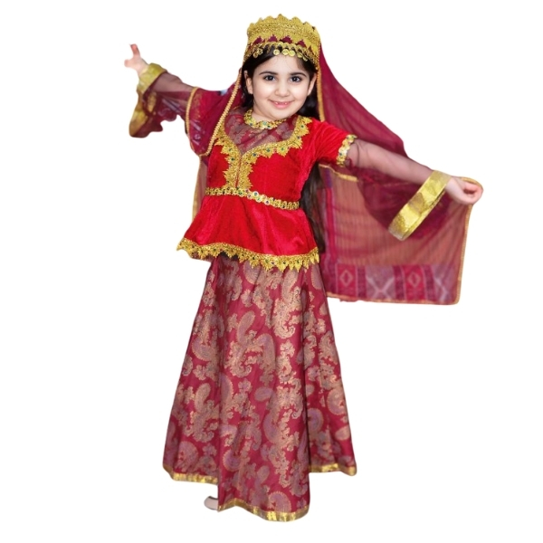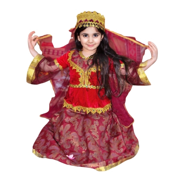 Bu qırmızı naxışlı milli geyim dəsti balaca xanımlar üçün həm rahat, həm də çox zərifdir. Üstdə parlaq qırmızı məxmər və qızılı krujeva haşiyələr istifadə olunub; bel xəttini vurğulayan kəsim fiquru səliqəli göstərir. Alt hissədə isə naxışlı atlas ətək tünd qırmızı -qızılı ornamentləri ilə xüsusi atmosfer yaradır. Şəffaf qollar, uyğun baş örtüyü və tac tipli bəzək kompozisiyanı tamamlayır, hərəkətdə yüngül dalğalanma verərək səhnə və fotolarda möhtəşəm görüntü yaradır.