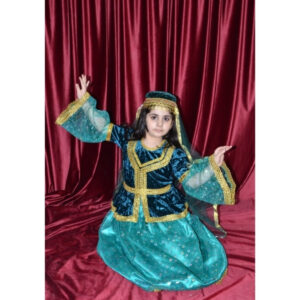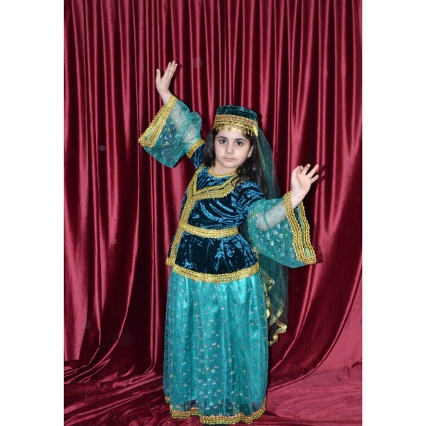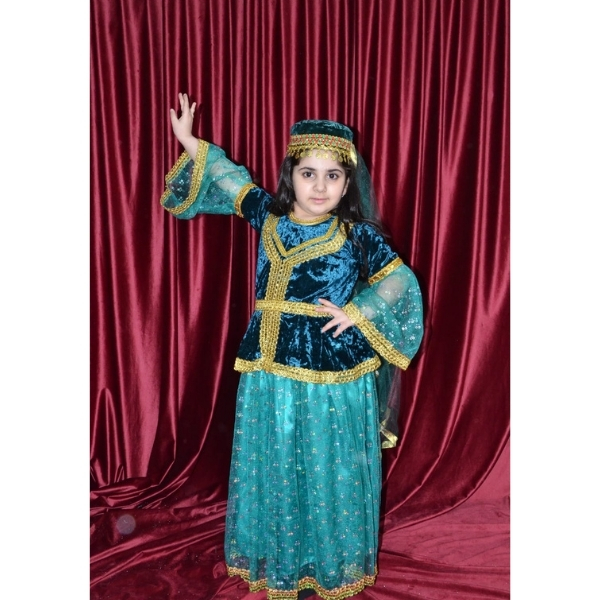Bu model qız uşaqları üçün hazırlanmış zərif və diqqətçəkən Azərbaycan milli geyimi nümunəsidir. Firuzəyi tonlarda hazırlanmış ətək və tünd məxmər üst hissənin uyğunluğu geyimə xüsusi estetik görünüş verir. Qızılı haşiyələr və milli ornament detalları modelə klassik və ənənəvi üslub qazandırır.