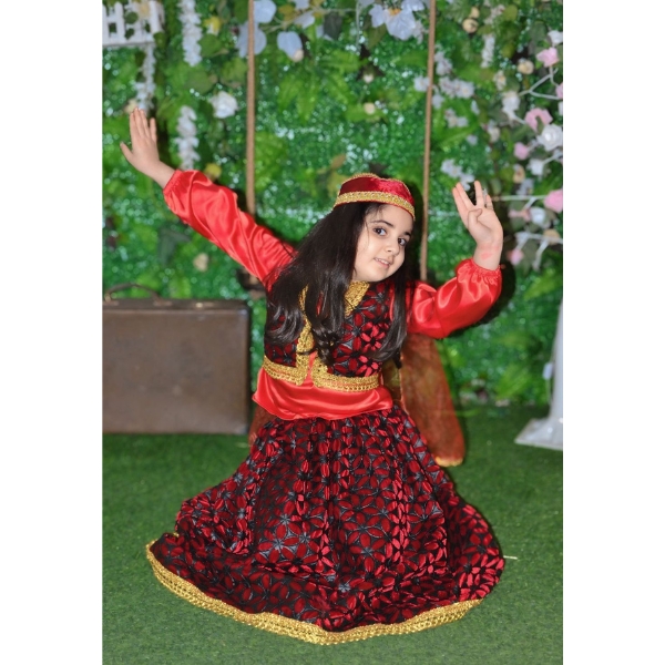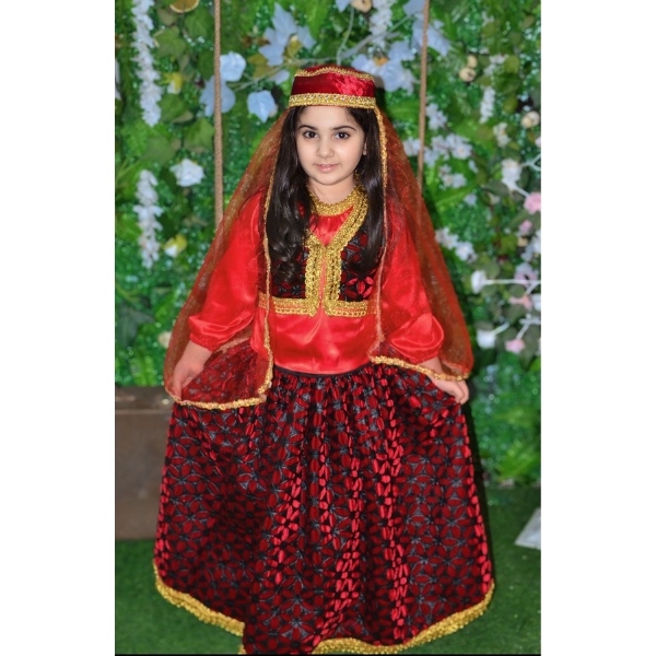Qız Uşaqları üçün Klasik Qırmızı Azərbaycan Milli Geyimi Azərbaycan milli geyim ənənələrinin uşaqlar üçün zərif və estetik formada hazırlanmış nümunəsidir. Bu model klassik milli üsluba əsaslanaraq hazırlanmış, rəng seçimi və ornamentləri ilə ənənəvi Azərbaycan qadın geyimlərini xatırladan görünüş yaradır. Qırmızı rəng milli mədəniyyətdə sevincin, bayramın və mərasimlərin əsas simvollarından biri kimi bu geyimdə xüsusi yer tutur.