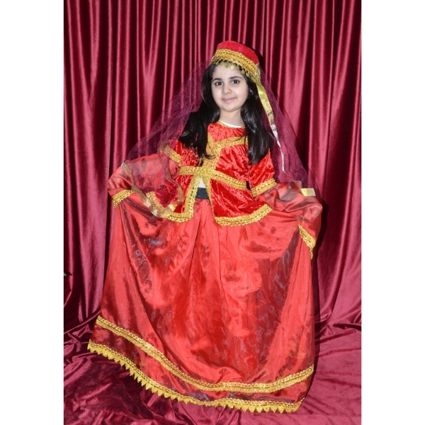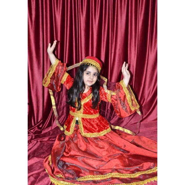 Bu model qız uşaqları üçün hazırlanmış zərif və diqqətçəkən Azərbaycan milli geyimi nümunələrindən biridir. Parlaq tünd qırmızı rəngli məxmər parça və qızılı haşiyə elementləri geyimə bayram ab-havası və klassik milli görünüş verir. Üst hissədəki qızılı işləmələr və ornament detallar modelin estetik görünüşünü daha da zəngin göstərir.