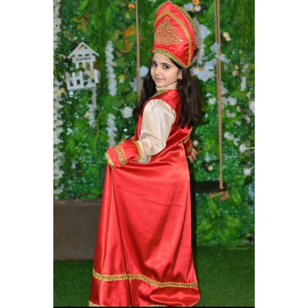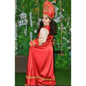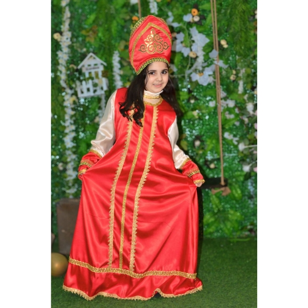Qız Uşaqları üçün Taclı Azərbaycan Milli Geyimi Azərbaycan milli geyim mədəniyyətində xüsusi yer tutan mərasim üslubunu uşaqlar üçün zərif və diqqətçəkən formada əks etdirən modeldir. Bu geyim ənənəvi uzun biçimi, parlaq atlas parçası və fərqləndirici baş geyimi ilə klassik milli obraz yaradır. Xüsusilə tac formalı başlıq geyimi digərlərindən ayıran əsas detal olub, geyimə bayram və mərasim ruhu qatır.
