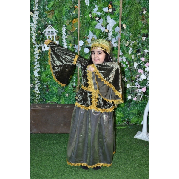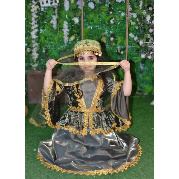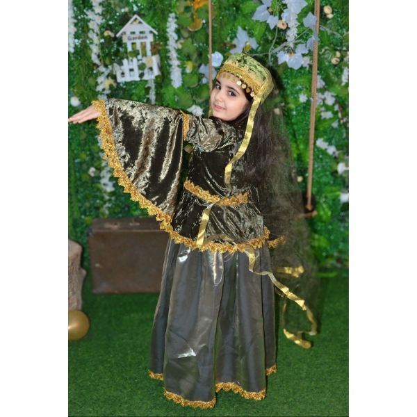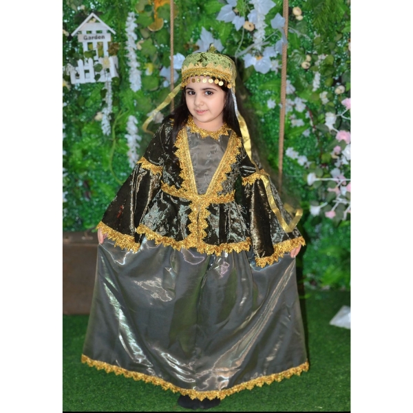 Bu yaşıl rəngli Azərbaycan milli geyimi qız uşaqları üçün hazırlanmış klassik və zərif modellərdən biridir. Tünd yaşıl tonlar üzərində qızılı naxışların harmoniyası geyimə həm milli ruh, həm də bayram əhval-ruhiyyəsi qatır. Üst hissədə məxməri parça effekti, geniş və axıcı ətək forması isə geyimin ənənəvi Azərbaycan üslubunu açıq şəkildə əks etdirir.