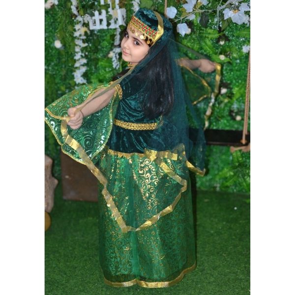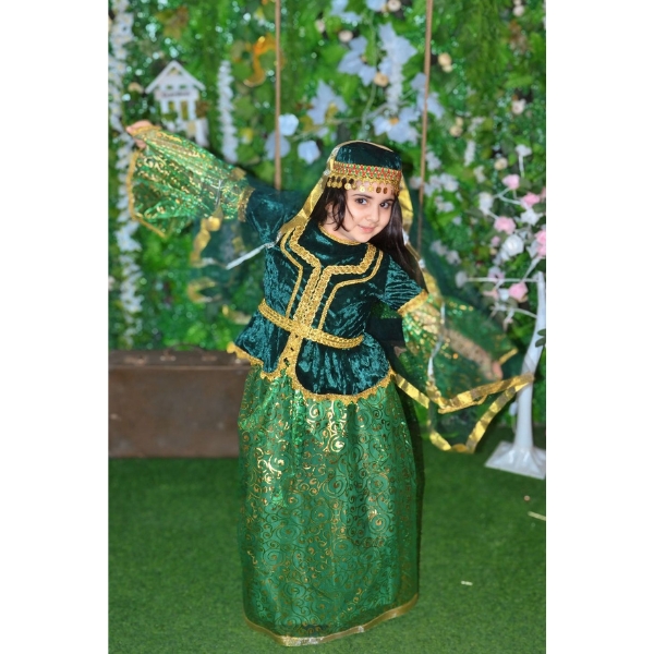 Bu model qız uşaqları üçün hazırlanmış klassik Azərbaycan milli geyimlərindən biridir. Yaşıl rəngli məxməri üst hissə və qızılı naxışlarla bəzədilmiş uzun ətək geyimə həm zəriflik, həm də milli dəyər qatır. Geniş qollar və axıcı parça forması milli geyim üslubunu tam şəkildə əks etdirir.